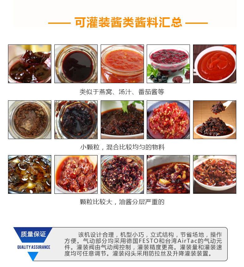 隨著機械技術的快速發展灌裝機的發展也是日新月異,使得其種類比較多。蘸醬在我國擁有悠久的歷史,在我國烹飪中占有著重要的地位,發展到現在在做菜和食品中也不可或缺,巨大的市場使得蘸醬灌裝機擁有巨
